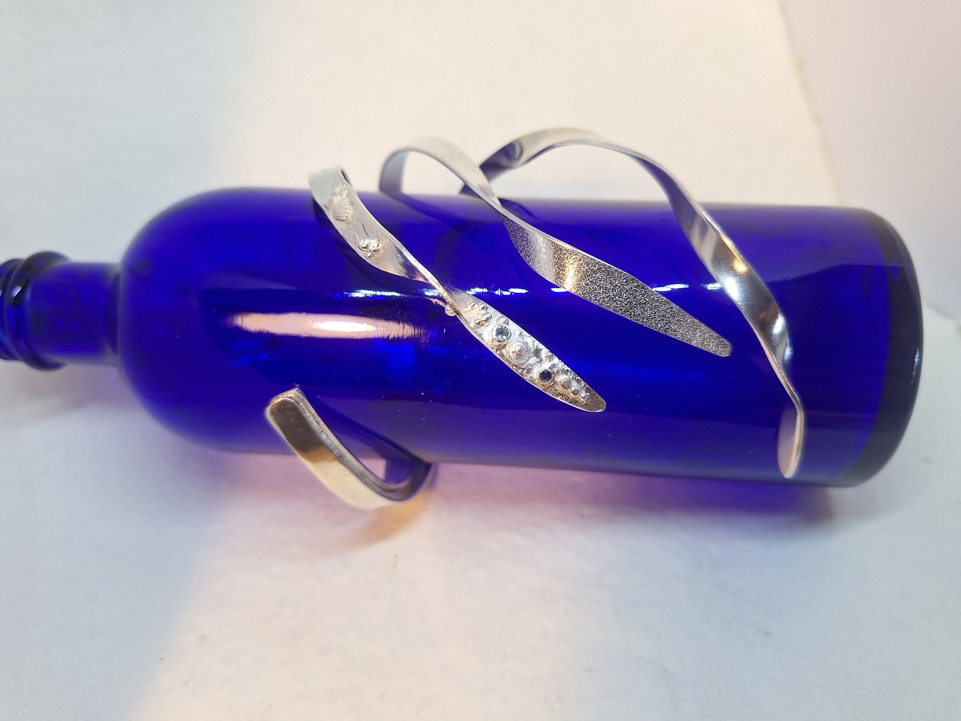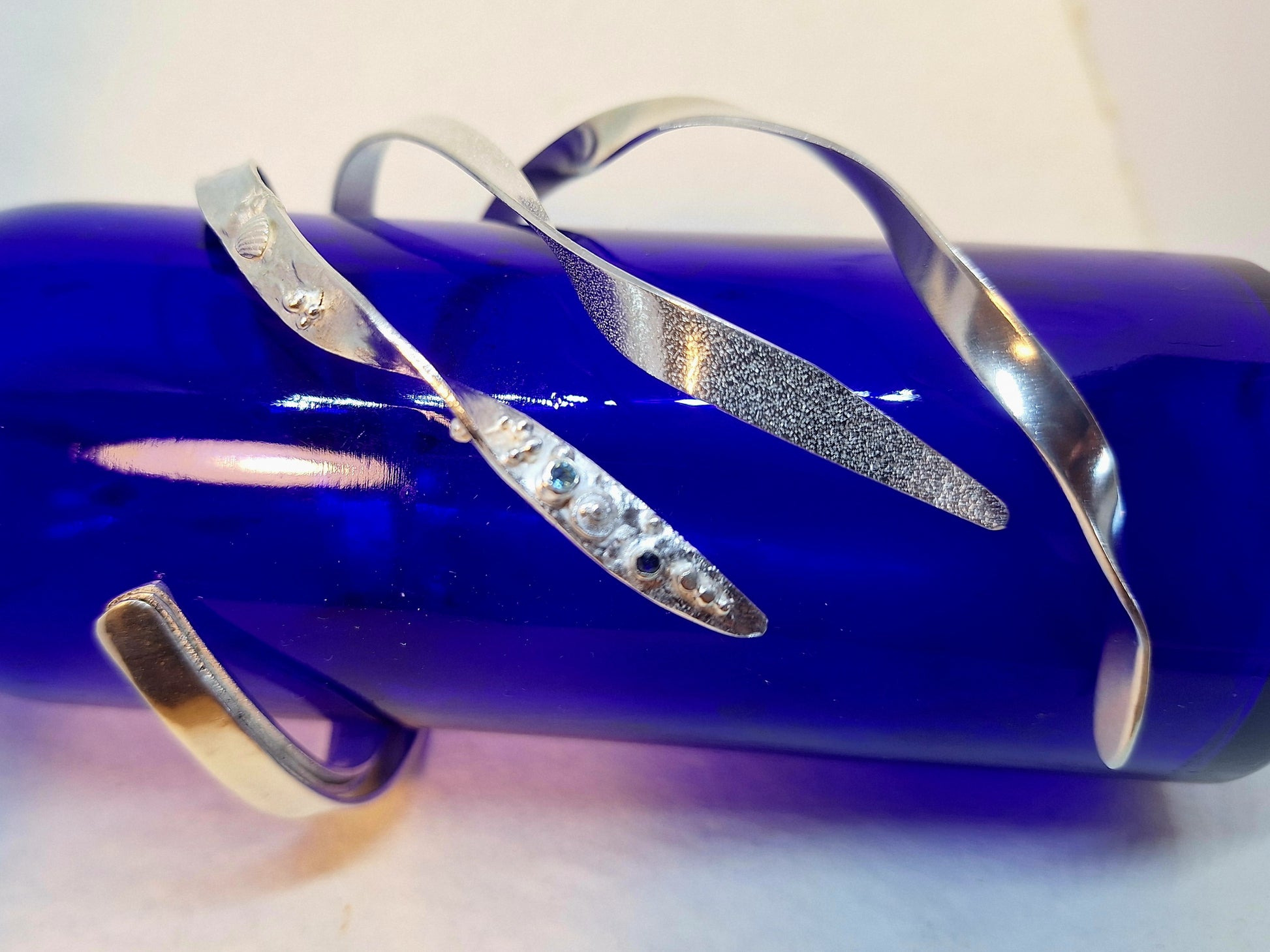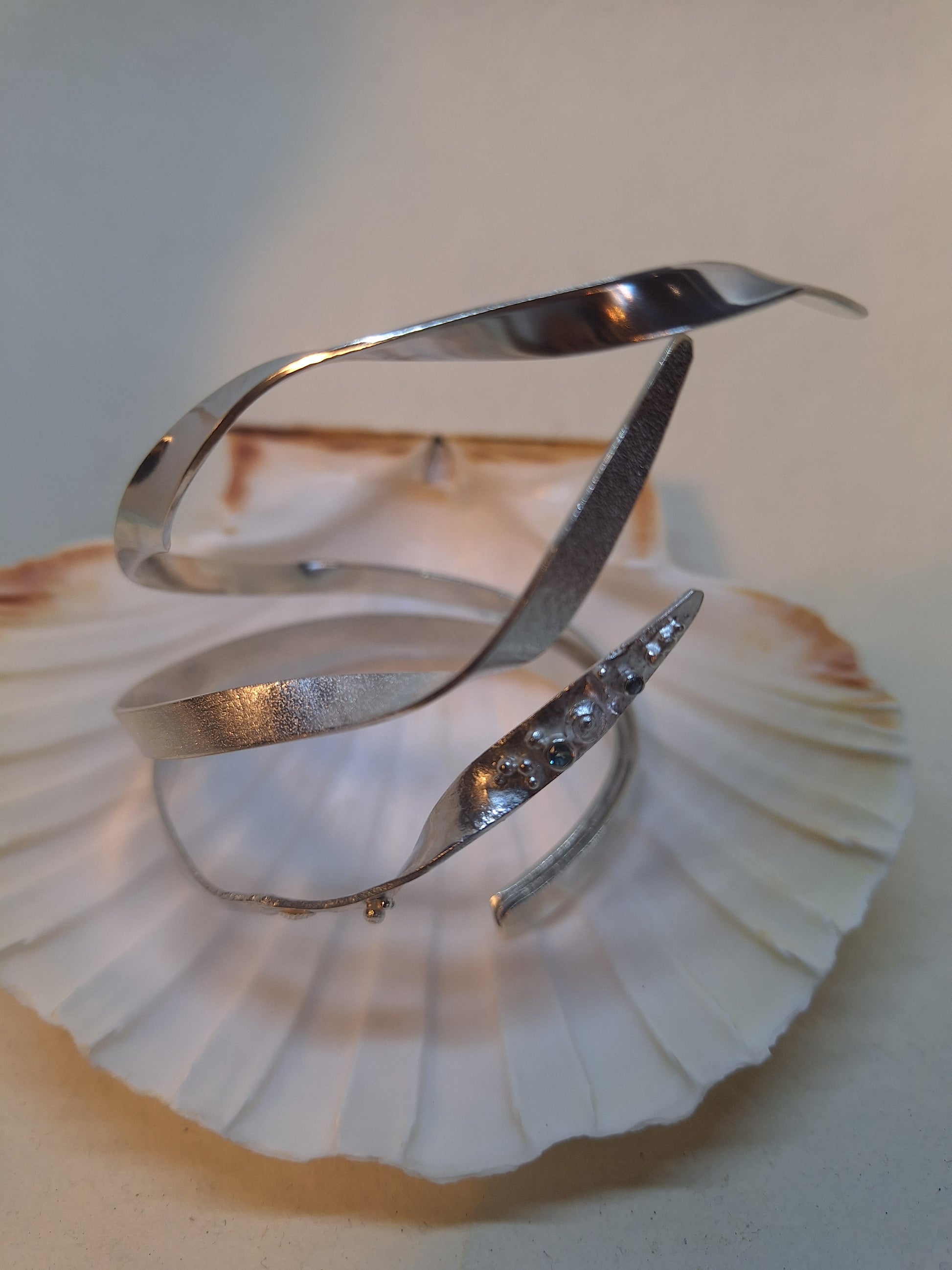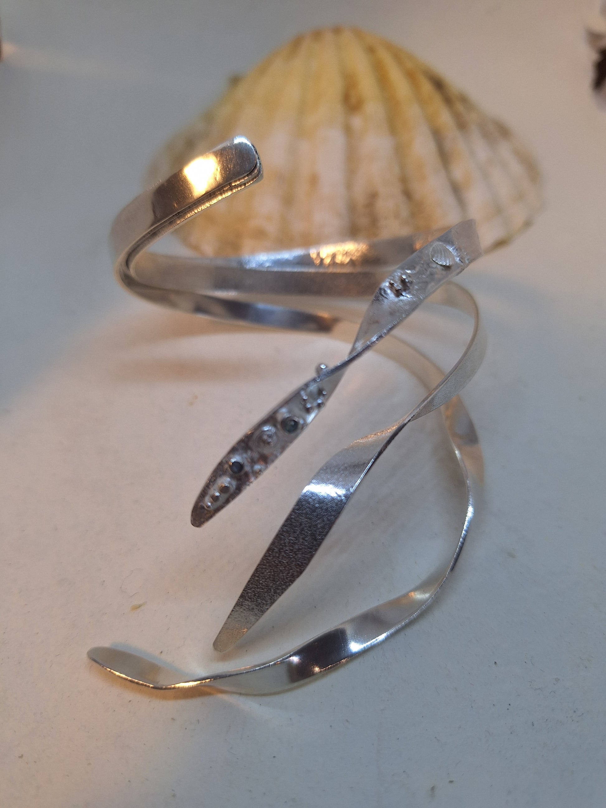 Statement Sea kelp sterling silver cuff inlaid with 2.5mm Swiss blue topaz and a 2mm blue black Australian sapphire and embellished with tiny granules of silver sand, a cockle and auger shell. Inspired by the Pembrokeshire coast.