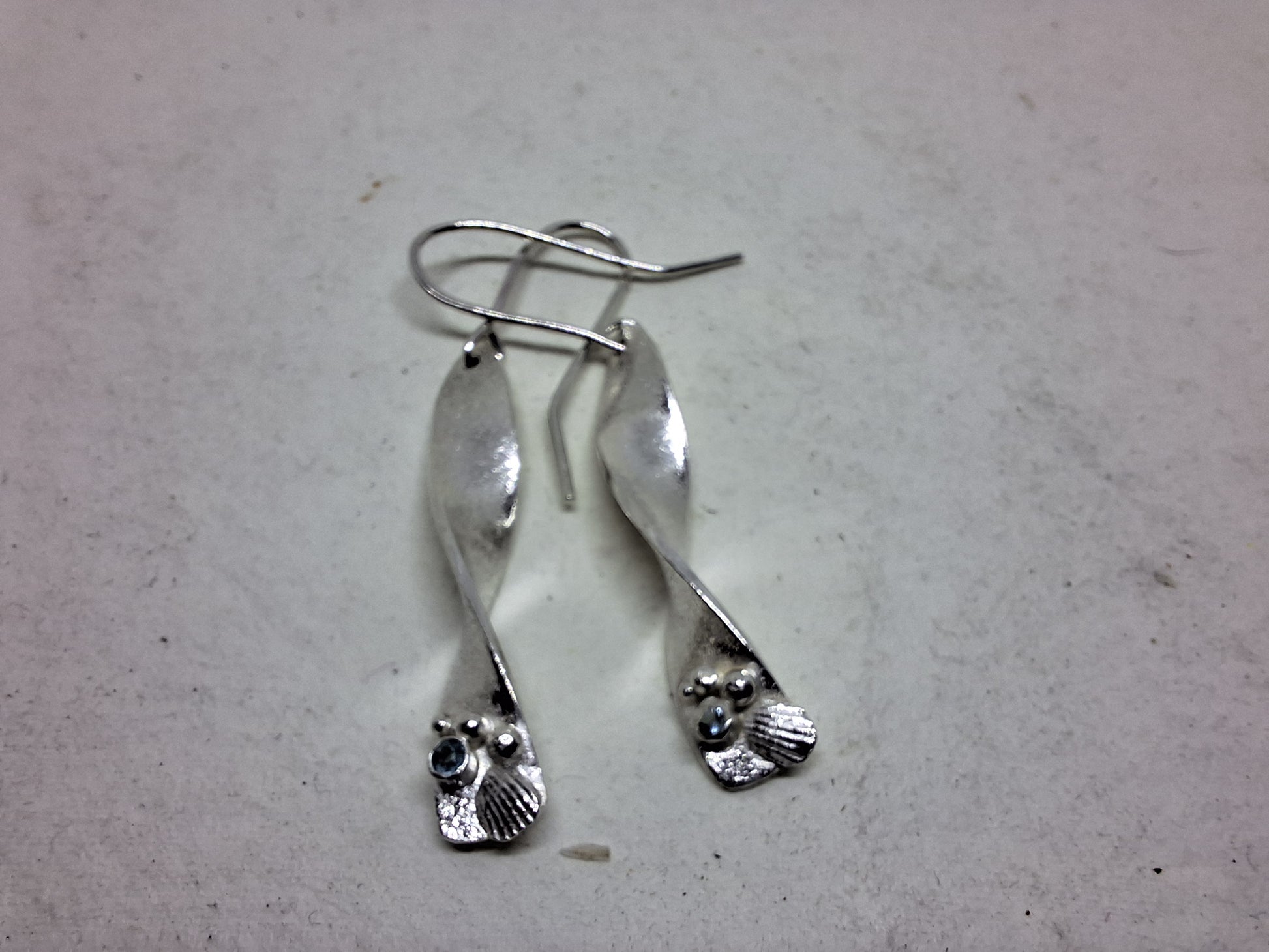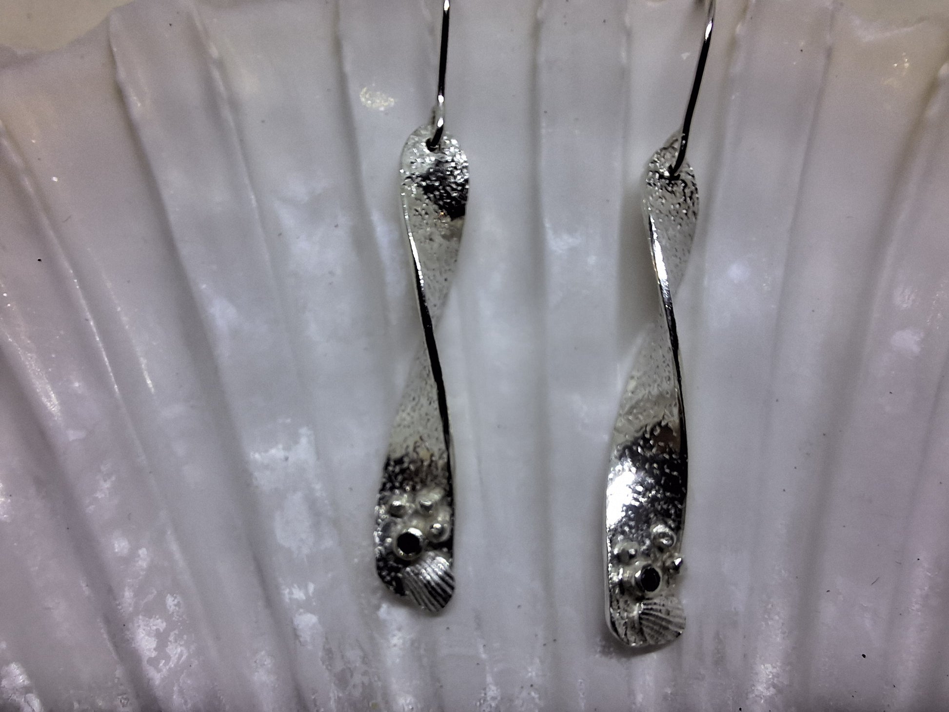 Sea kelp sterling silver drop earrings inlaid with 2.5mm blue black Australian sapphires or Swiss blue topaz and embellished with tiny granules of silver sand and a cockle shell, inspired by the Pembrokeshire coast.