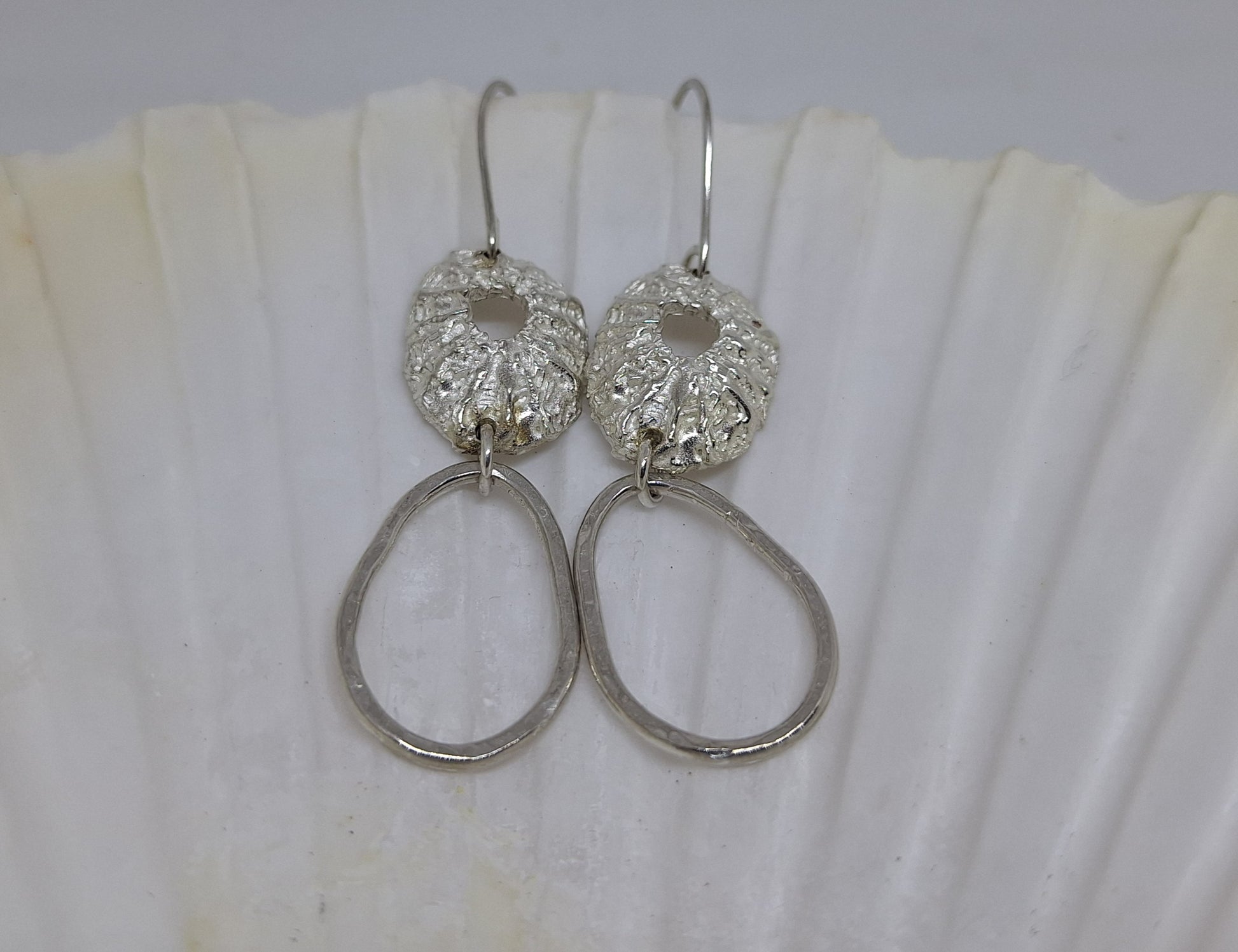 Beautiful sterling silver limpet and pebble drop earrings inspired by our oceans.